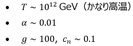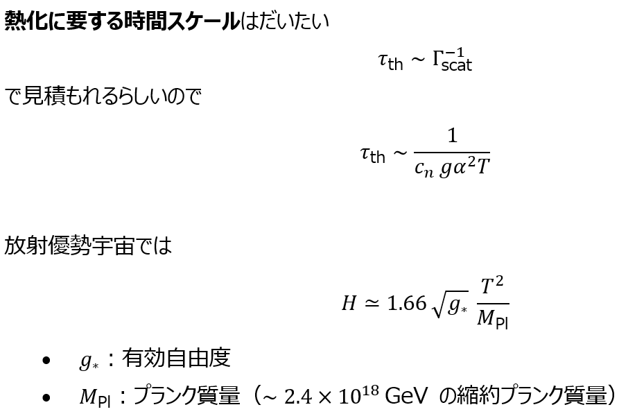 ここまででインフレーション終了付近(ポテンシャルの底)でインフラトン場が大量のインフラトン粒子に転換することがわかりました。ただ、まだ粒子生成が起きただけです。