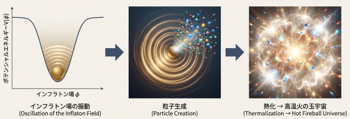 などは、モデル依存で研究が続いているようです。つまり、記事のような「インフラトン振動 → 崩壊 → 熱」という路線は有力な仮説のようですが、それが「正解」だ、とは言い切れないのが現状のようです。