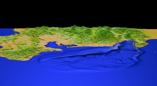 計算結果を3Dで任意の位置から見れるようになった。 ※安政東海地震に近い設定で計算 ※断層パラメータはwikipediaのデータを使用 まだ数値振動が若干あるがうまく封じ込めできている。