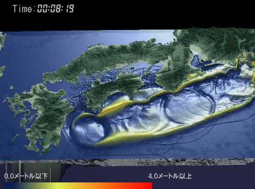 宝永地震(1707)での断層破壊による津波(古村モデル)の後少し沖合いで地殻変動が40分後に発生した場合を計算してみた。 ※モーメントマグニチュードMw:9.0を想定