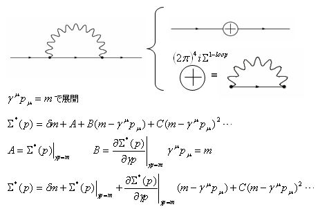 δmは質量補正で、繰り込みはこのように展開した級数の数項(発散次数)分を除去すれば良いのだった。なので繰り込み条件は