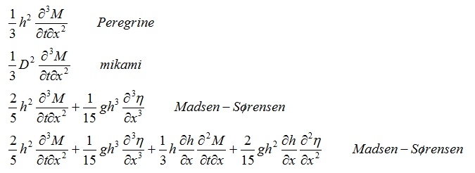 上から3個目は砕波減衰項と水底摩擦項を考慮したた以下の式になる。
